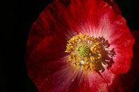Close-up van een robijn rode papaver. De bloem van de grote klaproos wordt verlicht door de ochtendzon. De meeldraden geven een mooie schaduw op het bloemblad.