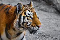 Alerte tijger van dichtbij gezien. De kleurrijke tijger is gefotografeert tegen een rotsachtige , zwart-wit achtergrond waardoor de tijger nog meer opvalt.
