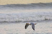 Close-up van een zilvermeeuw, Larus argentatus, laag vliegend over het water tegen een wazige achtergrond van rollende surfgolven. Geeft een echte strandsfeer die je alleen 's ochtends vroeg kunt ervaren als je bij zonsopgang langs de hoogwaterlijn loopt.