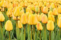 Een lente beeld vanuit Nederland met bloeiende gele tulpen met een rood randje, een close-up weergeven van een groot geel bloembollenveld.