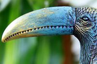 Macro opname van dichtbij van een kunstwerk van het hoofd van een toekan met zijn kenmerkende grote snavel.