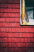 Rode leien als bekleding van een oude schuur met een stuk venster in close up. Dit schuurtje staat in Canada in de provincie Nova Scotia.