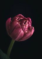 Een rood/ paarse dubbele tulp, close-up in beeld gebracht op een donkere achtergrond.