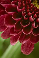Close-up van rode bloemblaadjes is een macrofoto van een roze bloem met op de achtergrond de stengel en groen van de bloem (en van andere bloemen).