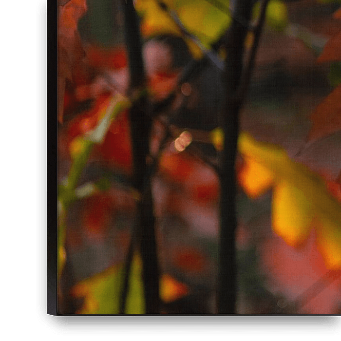 Een close-up van rode herfstbladeren met bokeh op de achtergrond die door het zonlicht worden gecreeerd. Kleuren zijn rood, oranje, geel en groen. Foto is gemaakt in het Mastbos in Breda.