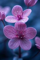 Deze betoverende afbeelding toont delicate roze bloemen in close-up, badend in zacht, diffuus licht. De fijne details van de bloemblaadjes en meeldraden zijn prachtig vastgelegd, waardoor een gevoel van verwondering en sereniteit ontstaat. Het ingetogen kleurenpalet en de zachte focus creëren een dromerige sfeer, perfect voor een rustgevende en stijlvolle ambiance.
