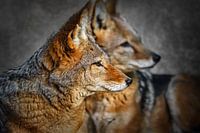 Een stel wolven / jakhalzen zitten samen bij elkaar, kijkend naar rechts. De compositie is zo gekozen dat beiden wolven goed van de zijkant te zien zijn.