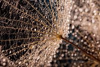 De structuur van deze vruchtpluisjes is heel fijn en vormt een prachtige structuur waar de waterdruppeltjes aan blijven hangen.
