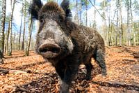 Prachtige opname van een wild zwijn (sus scrofa) in nationaal natuurpark de hoge veluwe in de lente