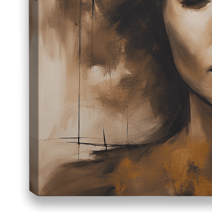 Dit olieverfwerk toont een vrouwengezicht, subtiel gecreëerd in abstracte lijnen, waarbij bruin- en beigetinten de zachte contouren benadrukken. De minimalistische vormgeving laat de expressie open voor interpretatie, terwijl de warme kleuren een gevoel van kalmte en diepgang oproepen.