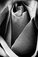 Closeup van een roze roos in zwart wit waarbij de bloemblaadjes een berglandschap vormen.