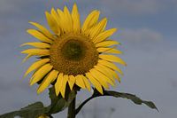 Closeup van een schitterende zonnebloem op een zomerse dag tegen een blauwe lucht als achtergrond