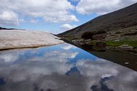 Door de smeltende sneeuw hebben zich kleine bergmeertjes gevord in Sierra Nevada. Op deze foto weerspeigeld de blauwe lucht met wolken in het meertje.