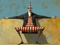 Clown Schilderij | Whispers of a Forgotten Clown - Dit clown schilderij toont een figuur met een gestreept kostuum en een langwerpige, kegelvormige hoed, zittend tegen een uitgesleten, blauwe achtergrond.