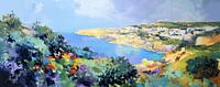 Coastal Canvas - Dit abstracte schilderij toont een kleurrijk, levendig landschap van Malta met een visuele speeltuin van blauwe wateren en bontgekleurde flora.