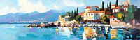 Details: Mediterrane kustlijn, abstract schilderij, moderne kunst, reflectie in water, kleurrijke architectuur, landschapsschilderij,…