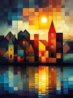 Een betoverende zonsondergang legt een prachtige deken van diepe, zachte warme kleuren over het onderliggende landschap. Het silhouet van de kleine kustplaats wordt langzaam gevangen in een warm kleurenpallet van vredige serene rust.