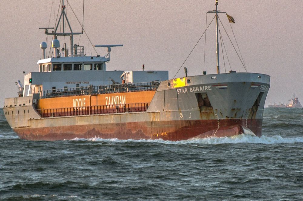 De coaster Star Bonaire onderweg van Engeland naar de haven van Amsterdam. Het schip was flink bezig op de golfslag van de Noordzee. Hier vaart ze vlak voor de pier van IJmuiden.