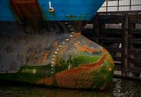 Tijdens een fietstocht kwam in een achteraf haven. Er lagen twee schepen afgemeerd. En als je de sporen op deze boeg ziet waren ze wel aan een pauze toe. De sporen zijn een kunstwerk misschien wel voor aan u muur.