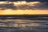 Een coaster vaart uit over het Nauw van Calais langs de kust van Noord-Frankrijk. De ondergaande avondzon schijnt in de vorm van een Jacobsladder door het wolkendek. Deze foto is gemaakt in de Zomer van 2012.
