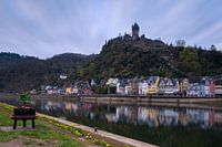 Panoramisch uitzicht op de stad Cochem aan de Moezel met de burcht Reichsburg in de vroege ochtend kort voor zonsopgang, Rijnland-Palts, Duitsland