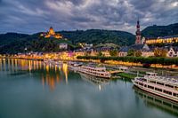 Cochem is een van de bekende wijnstadjes gelegen aan de Duitse Moezelrivier. We zien hier de stad met avondverlichting en de Rijksburcht op de heuvel boven de stad.