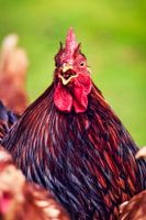 Mooie gemêleerde haan diep rood gevlamd. Een haan zoals een haan hoort te zijn, gezond en in zijn element scharrelend in vrijheid. Druk in de weer met zijn hennetjes waar hij een echt haantje voor mag zijn.