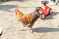 De trotse, kleurrijke haan in het prachtige gouden zonlicht was de ster van de show. Alle aandacht van de groep leerlingen was op hem gericht.