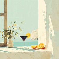 Een mediterraan tafereel waarin een elegante cocktail met sinaasappelgarnituur centraal staat tegen een achtergrond van turquoise zee. De compositie wordt verrijkt door een vaas met delicate bloemen en verse sinaasappels, terwijl het zachte zonlicht schaduwen werpt in deze rustgevende scène die doet denken aan een zorgeloze vakantiedag aan de kust.