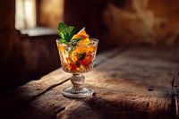 Een verfrissende drank, kunstig gedrapeerd in een elegant glas, straalt uitnodigende kleuren en frisse aroma's uit. Met heerlijk fruit en een vleugje munt ziet het eruit als een feestelijk hoogtepunt. Perfect voor in de keuken of woonkamer, waar het schittert in het licht en meteen vrolijkheid verspreidt.