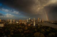 Zelden hachelijkere momenten op de Euromast meegemaakt! Ik stond naar adem te happen in de wind, de mast trilde en kreunde, bewoog duidelijk voelbaar heen en weer. Ik dacht: "Hoe kom ik hier zo snel mogelijk weer vanaf?" Toch besloot ik nog even te rekken omdat de wolken ZO prachtig waren... en er kwam zojuist toch een depressie langs! Over de SS Rotterdam waaide het gevaarte over de Kop van Zuid heen, bakken met regen kwamen naar beneden terwijl de zon aan de andere kant al vrij laag stond... regenboog als toetje!
