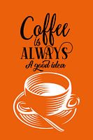 Een grafisch ontwerp van een koffiekopje en lepel tegen een oranje achtergrond en witte tekst met de zin "Koffie is altijd een goed idee". De afbeelding heeft een warme en een uitnodigende sfeer die geassocieerd wordt met het genieten van een kopje koffie op een gezellige plek.