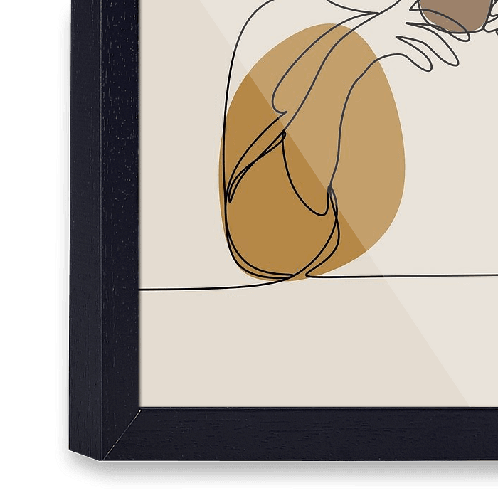 One line drawing in aardetinten van een meisje met hoed en een kopje koffie in haar hand. Heel erg leuk aan de muur!