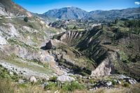Colca Rivier in Arequipa gebied, stromend tussen hoge bergen van de Andes, Peru. Ruwe natuur, rotsen, planten. Foto is genomen in de buurt van Chivay, vlak voor de Colca Canyon.