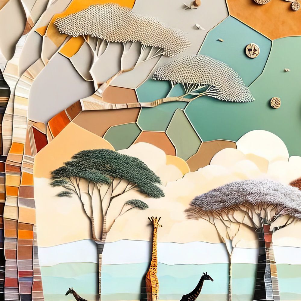 Samen met AI gecreëerde collage. Thema: Senegalees landschap met baobab bomen en giraffen. Geïnspireerd op het natuurreservaat Bandia. In dit wildpark leven giraffen, zebra's, antilopen, kudu's, impala's, gazellen en bokken, witte neushoorns, oryxen, buffels, apen, struisvogels, krokodillen, schildpadden en heel veel schitterende vogels. Maar het allermooist vind ik de bomen: reusachtige baobabs en sprookjesachtige acacia's.