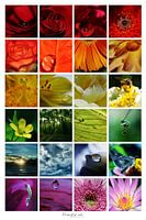 Een collage van verschillende macro foto's van water druppels op bloemen en planten.