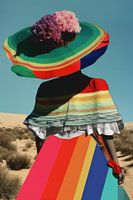Collage "Colorful fashion". Deze verrassende collage fleurt iedere muur op. Een niet alledaags werk vol kleur: we zien een vrouw met kleurrijke kleding en een grote hoed in een natuurlijke omgeving.