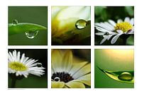 Een collage van zes verschillende macro foto's. Bloemen blaadjes en water druppels.