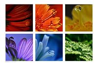 Een collage van zes verschillende macro foto's. Bloemen en baadjes met dauw druppels.