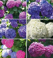 Bloeiende tuinhortensia, bloemen in de kleuren wit (Hortensia Annabelle), roze en blauw (Hortensia Macrophylla). Je vindt deze prachtige struiken ook vaak bij boerderijen. Bloemencollage, zomerbloeier, zomergevoel, zomerseizoen. Mooi als kleurrijke tuinposter.