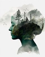 Collage met de titel "Nature is my best friend". Dit is een zogenaamde "double exposure". Dit is een oude techniek waarbij je vroeger twee foto's over elkaar maakte op een rolletje. Tegenwoordig gebeurt het digitaal, maar het effect is nog steeds verrassend! Een bijzonder werk voor liefhebbers van natuur, portretten en collages!