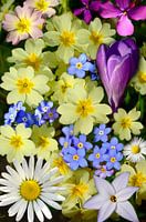 Een foto met bloemen die in het vroege voorjaar in mijn tuin bloeien. Primula's, Vergeet-me-nietjes, Ipheion, Krokus, Margriet, Judaspenning en Madeliefje. Met fotobewerking heb ik het hele beeld weten te vullen met de bloemen die afwisselend voor,- en achter elkaar zijn geplaatst. Alle bloemen heb ik van dichtbij gefotografeerd zodat de details goed te zien zijn. Een vrolijke impressie van de lente waar elke bloemenliefhebber van kan genieten,