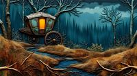 een versierde zigeunerwagen staat 's nachts alleen in een bos - collage