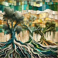 Digitale collage. Onderwerp: fromager-bomen in Senegalees bos landschap. De achtergrond lijkt geplakt papier. De bomen lijken 3D.