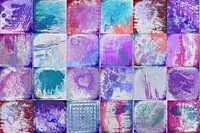 Collage met paars roze kleuren. Vierkantjes van verschillende kleuren samengesteld tot een groter geheel. Gemengde techniek. Grunge. Moderne abstracte kunst. Mixed media.
