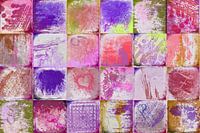 Vierkantjes van verschillende kleuren samengesteld tot een groter geheel. Gemengde techniek. Grunge. Moderne abstracte kunst. Mixed media.