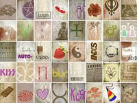Collage met symbolen, tekst en krabbels. Er is van alles te zien en te lezen op deze collage.
