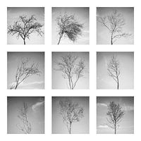 9 zwart-witfoto's als collage. De bomen zijn in de winter gefotografeerd om het grafische effect van de leegte en het filigrane uiterlijk te benadrukken.