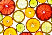 Collage van schijfjes fruit met een witte achtergrond. Grapefruit, sinaasappel, citroen, limoen en mandarijn.