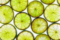 Collage van schijfjes limoen met een witte achtergrond en veel structuur.